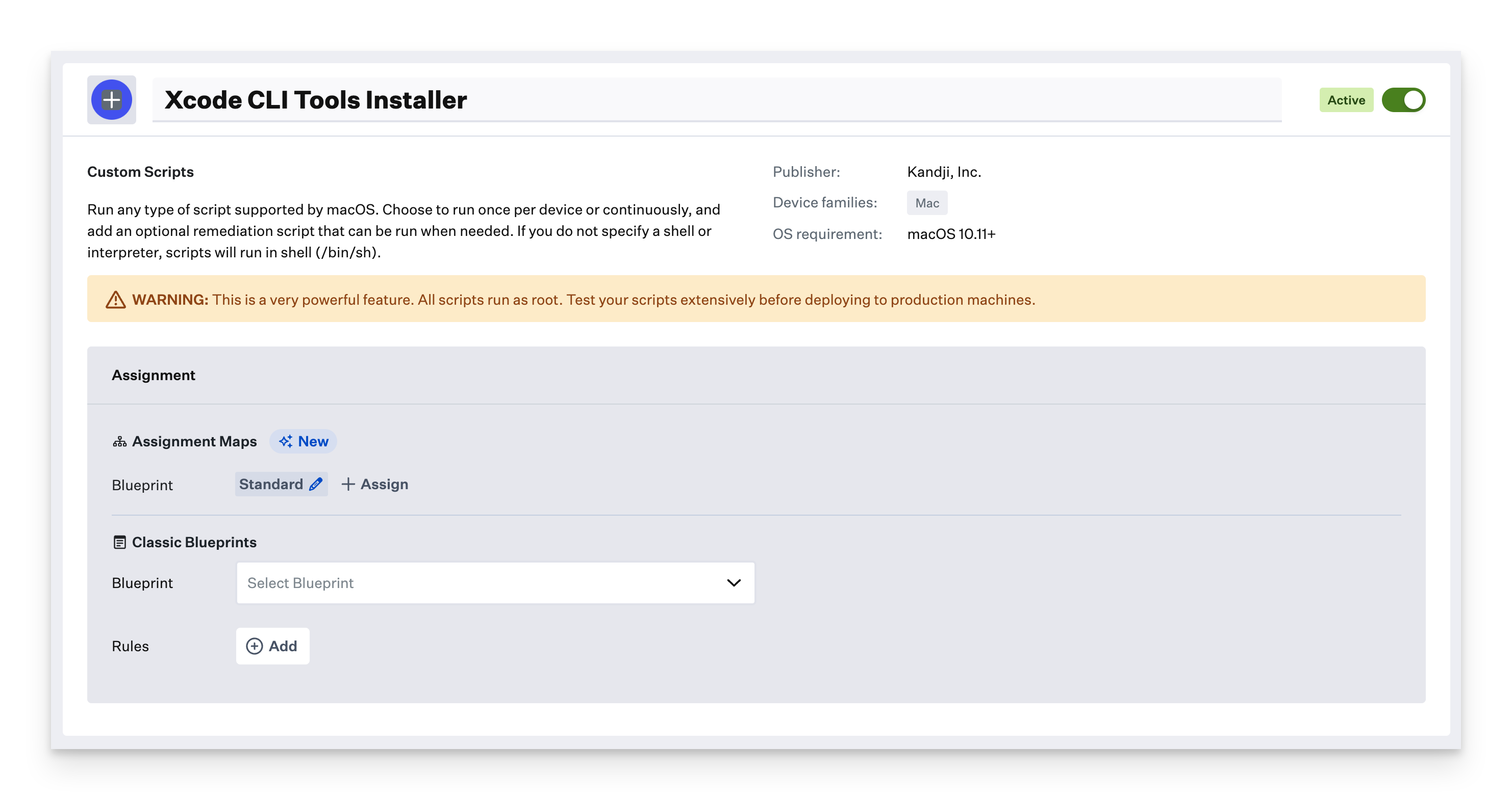 Kandji Custom Script library item showing Assignment section with Blueprint selection