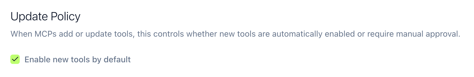 Enable new tools by default: New tools automatically become available to users. Good for development environments where you want quick access to new capabilities.